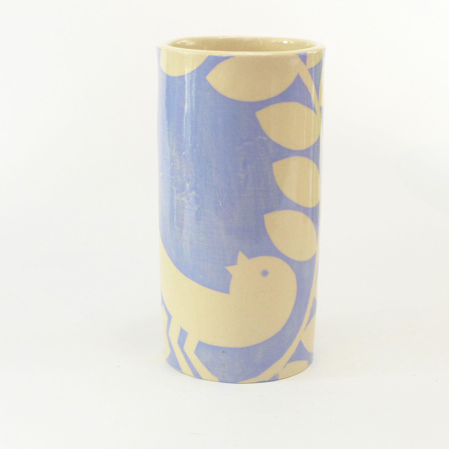 Each piece is hand built from slabs of clay and decorated using hand cut stencil decoration. I have a strong belief that Ken's work makes you happy.