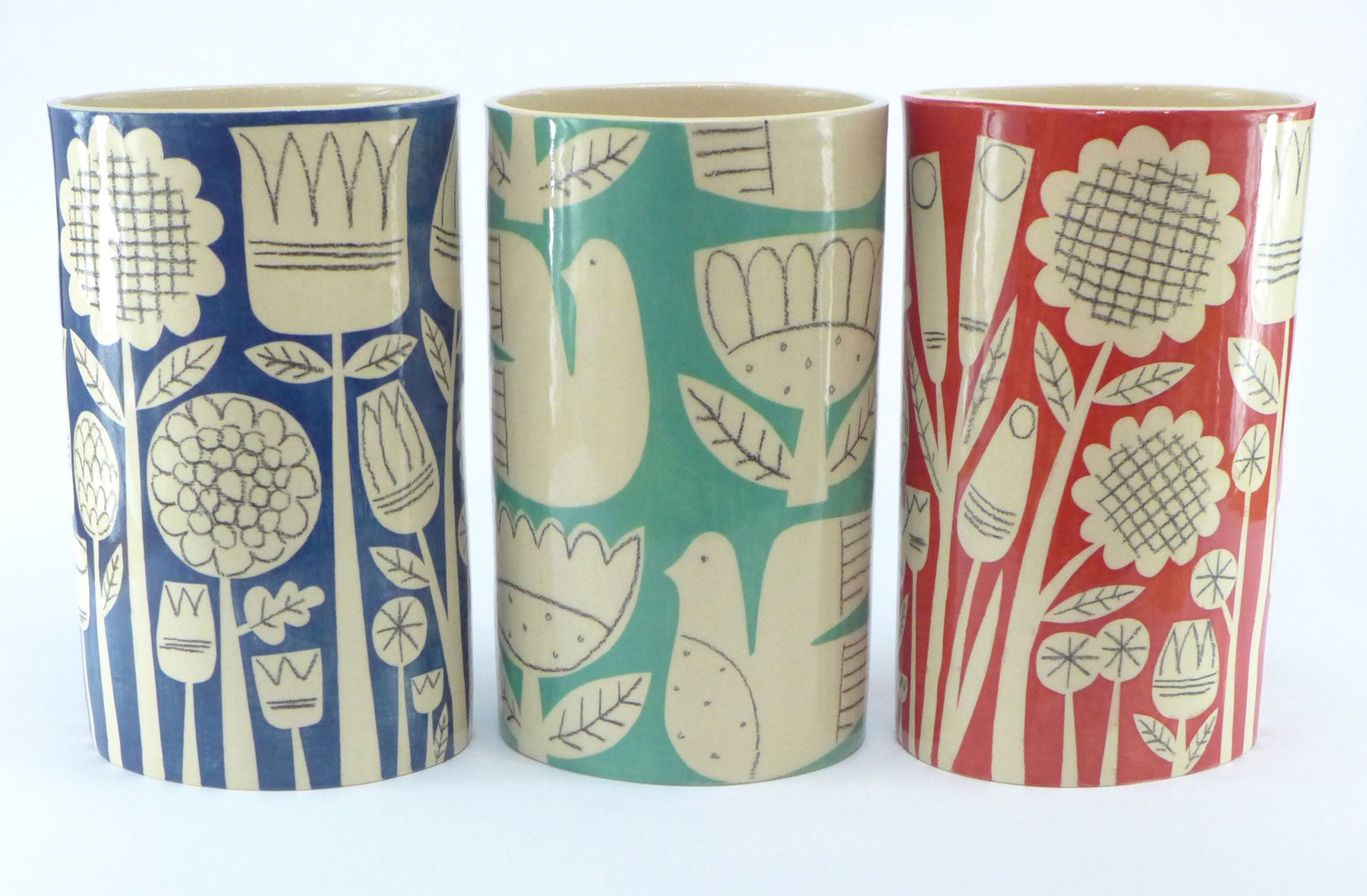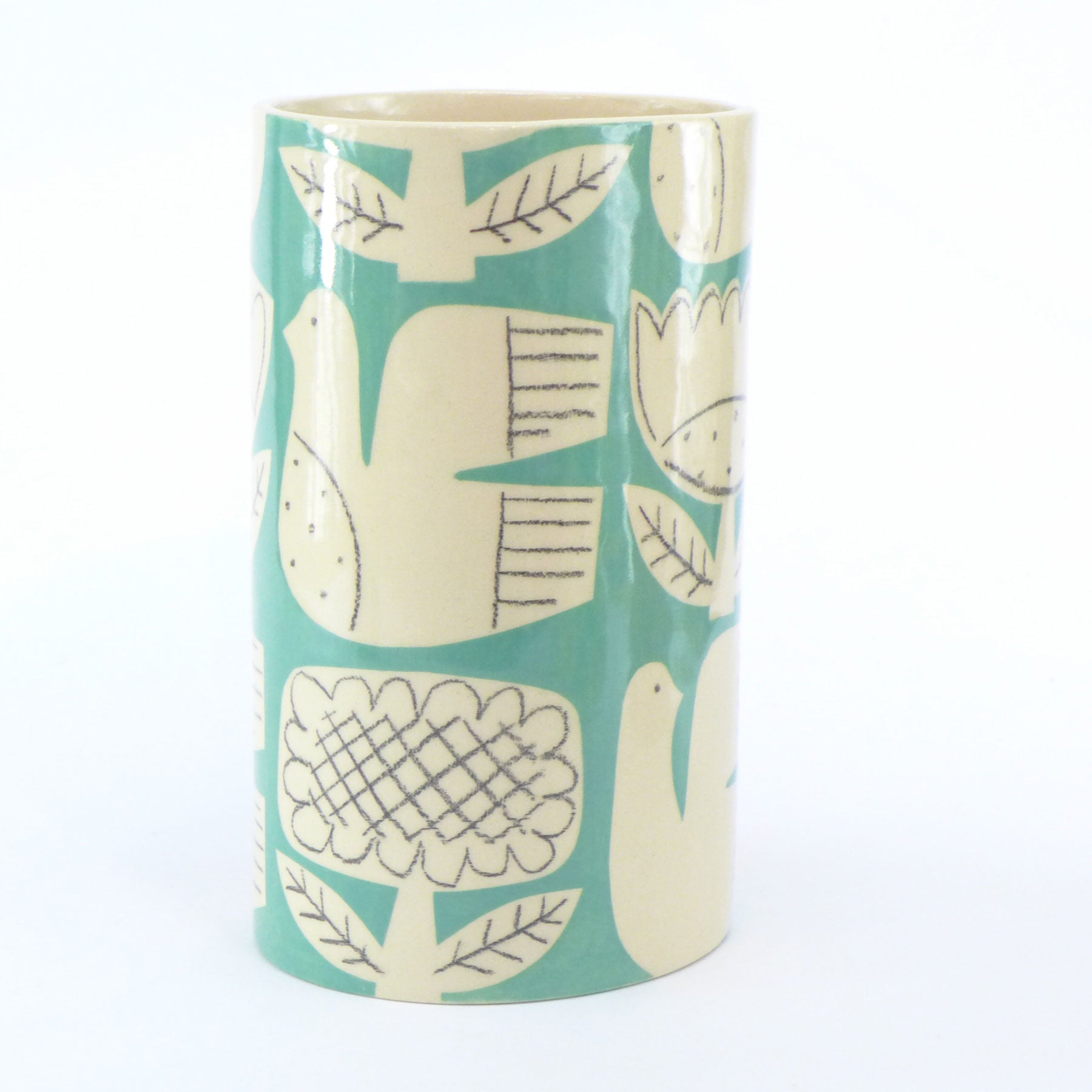 Each piece is hand built from slabs of clay and decorated using hand cut stencil decoration. I have a strong belief that Ken's work makes you happy.