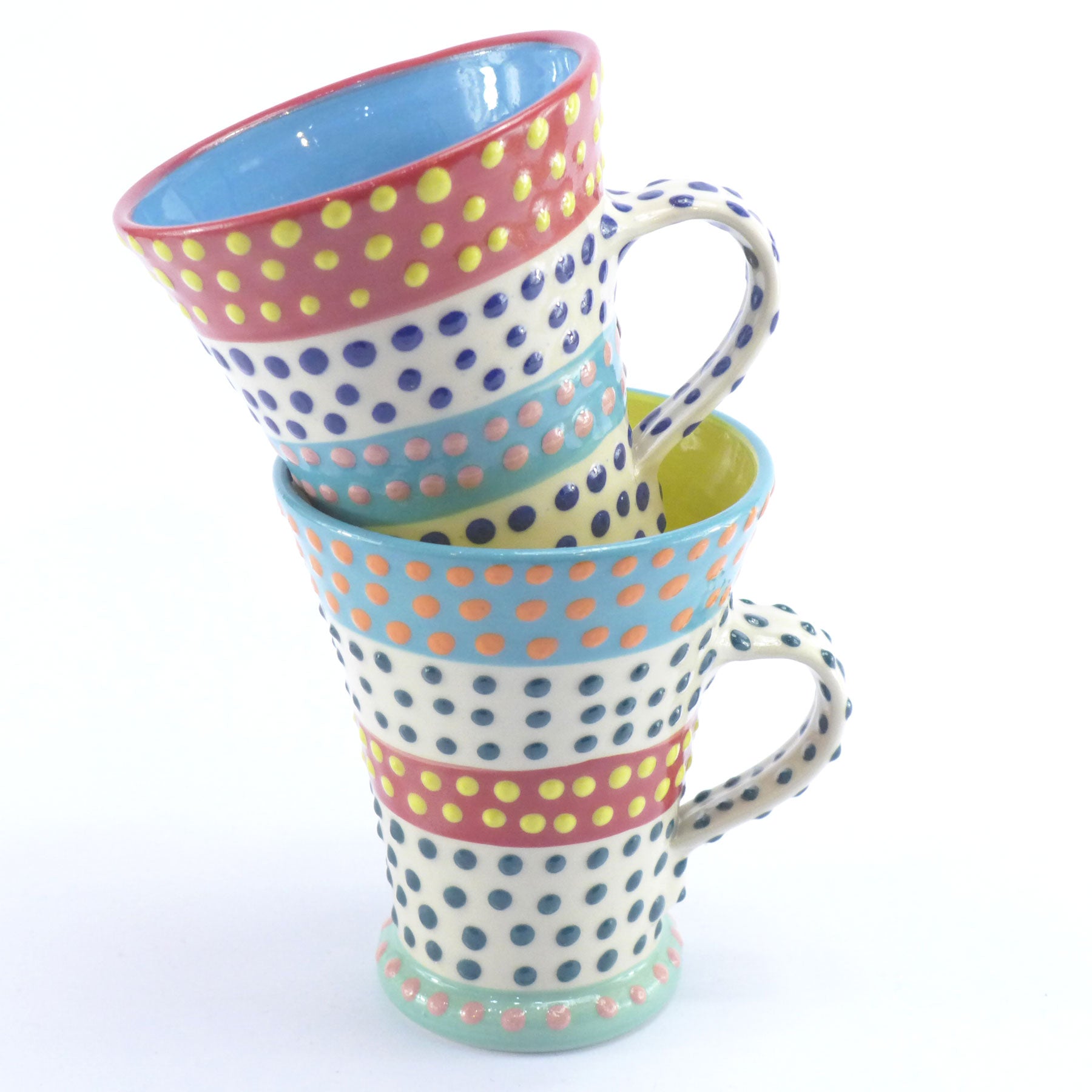 Each dot of coloured slip is applied by Lincoln's patient hands. His work is wonderfully tactile and fired to low stoneware is both dishwasher and microwave proof.