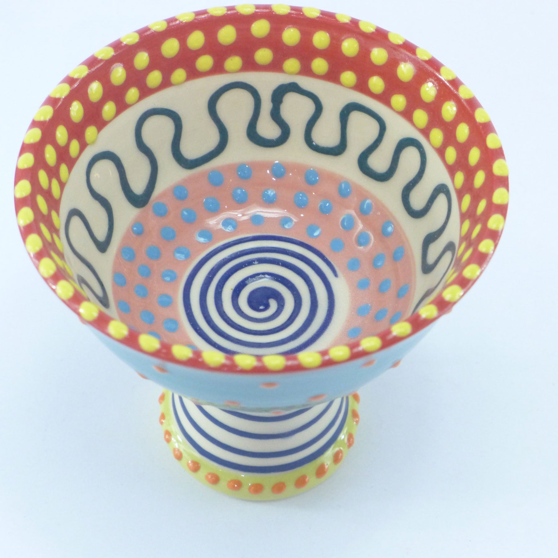 Lincoln mostly makes wheel thrown tableware which is extensively decorated employing 'slip trailing' which gives the decoration a distinctive raised surface. Colourful designs, as well as simpler blue and white designs are used to convey a sense of fun and joyousness in the work. Born and raised in a small coastal town in Australia Lincoln has travelled extensively which has informed his work as well as a keen interest in archaeology having worked on many excavations around the world he now resides in south west Cornwall.