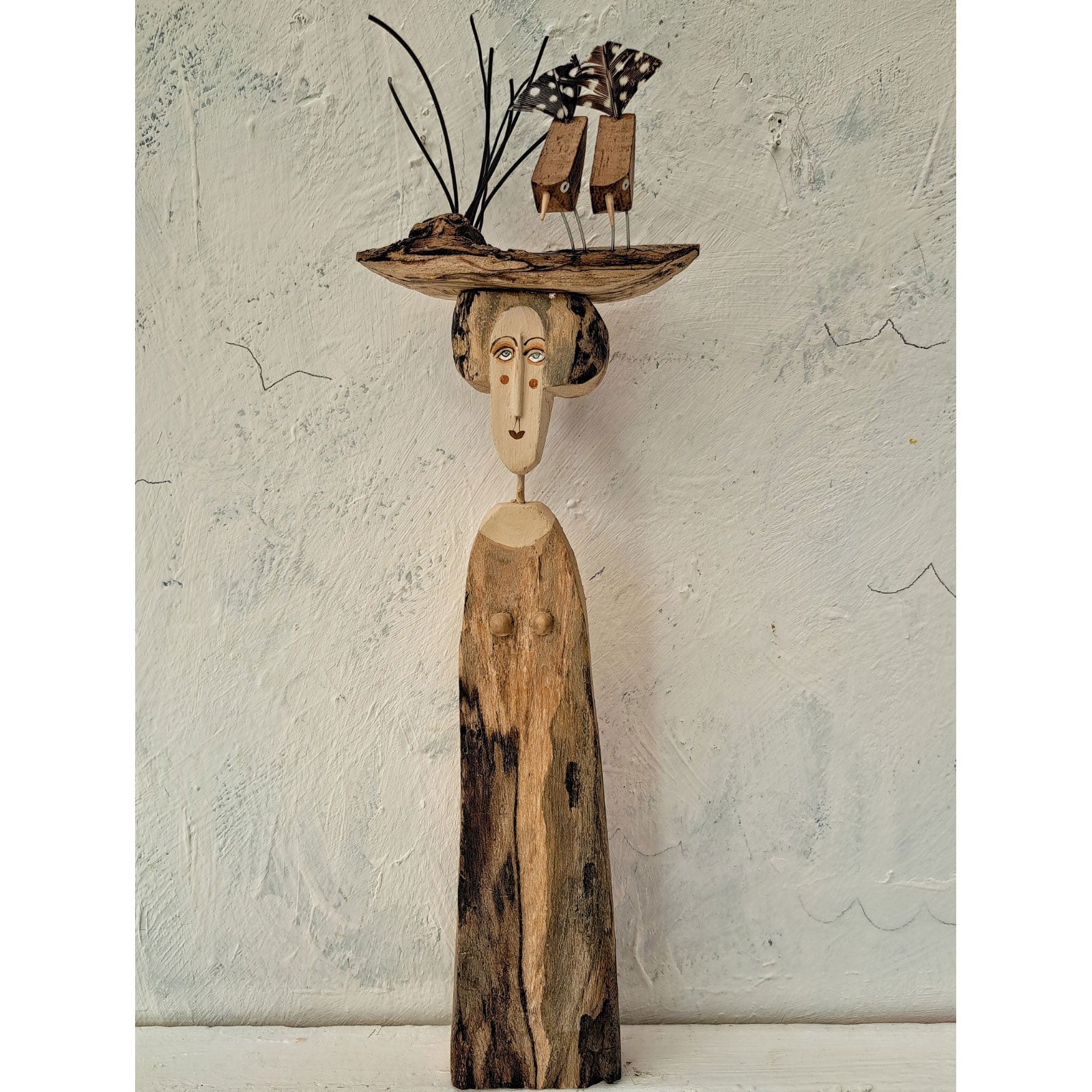 Lynn's figures are carved from driftwood and then painted with her humourous take on their character. The small details of their expressions, hair and clothing create a piece guaranteed to make you smile. They are great to put in pairs or groups in the gallery (or your home...) looking either askance or conspiratorially at oneanother