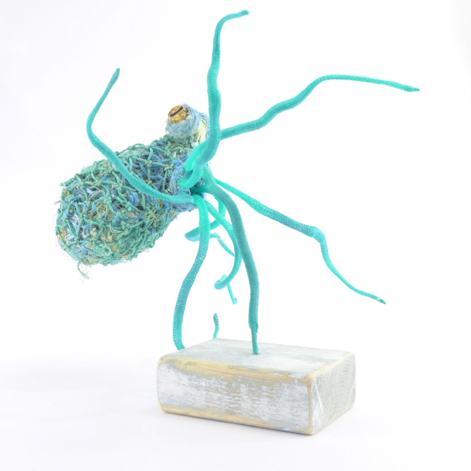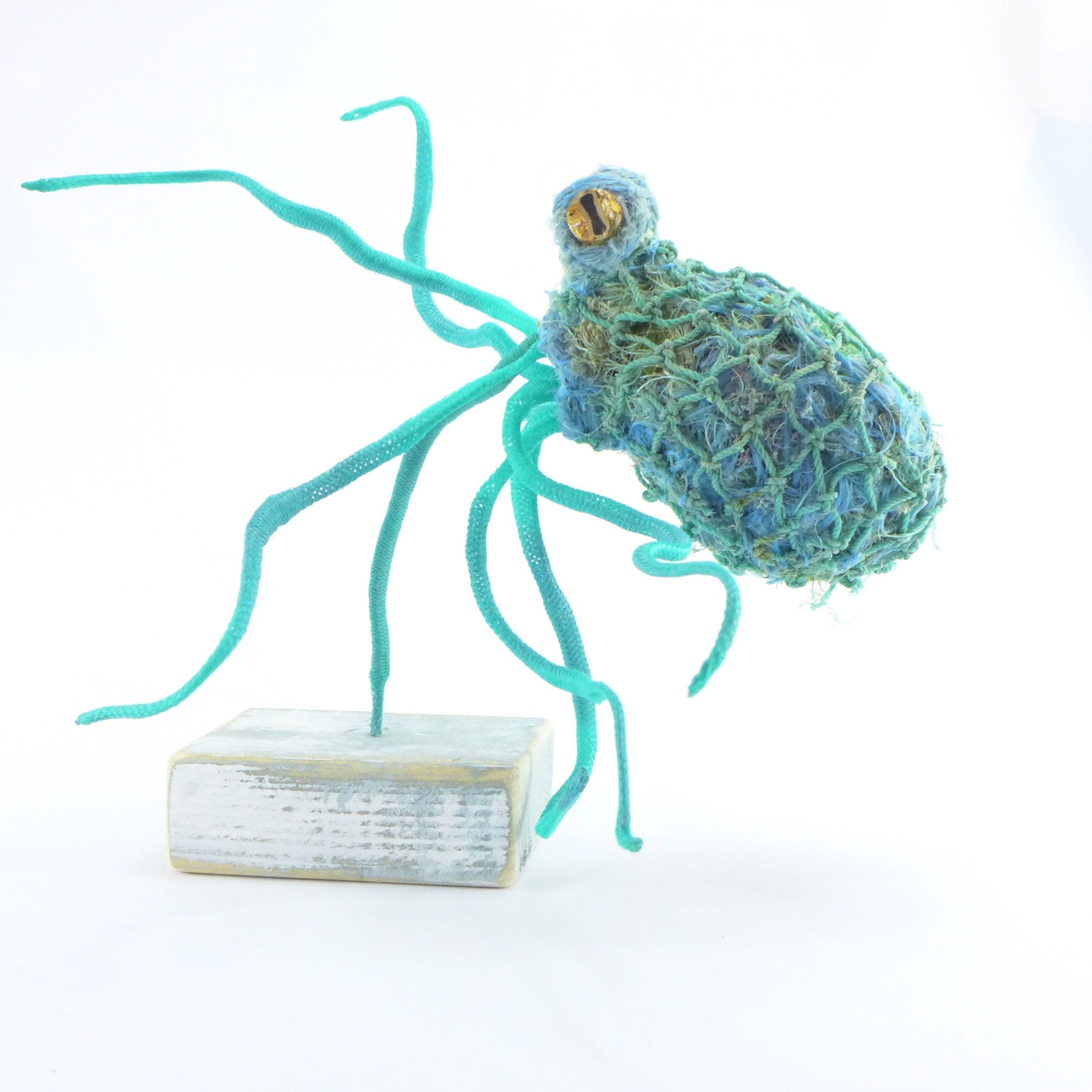 Media: Beach trash, recycled fishing net, rope, wire, driftwood and throat lozenge eyes.